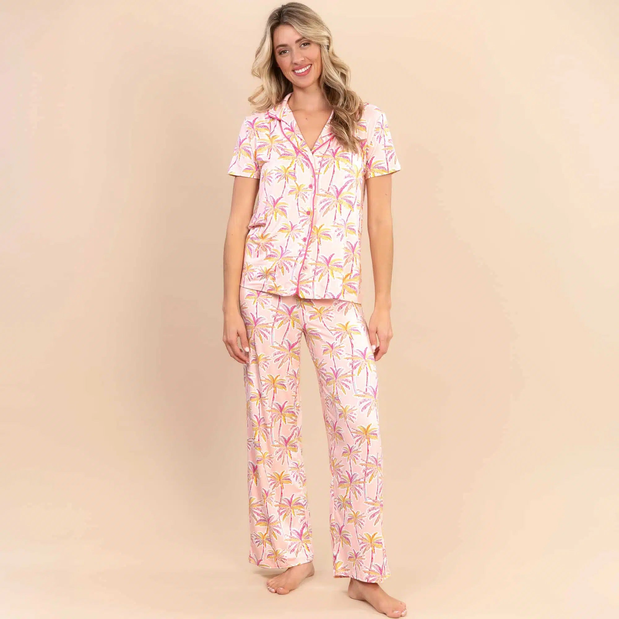 Lounge in paradise with our breezy and bold ‘Pink Palm’ pajama pants!