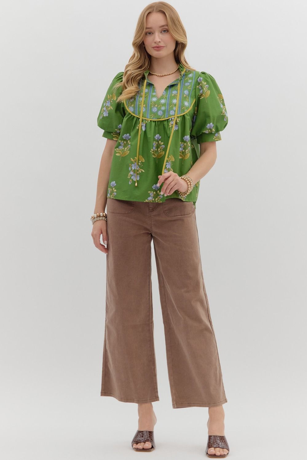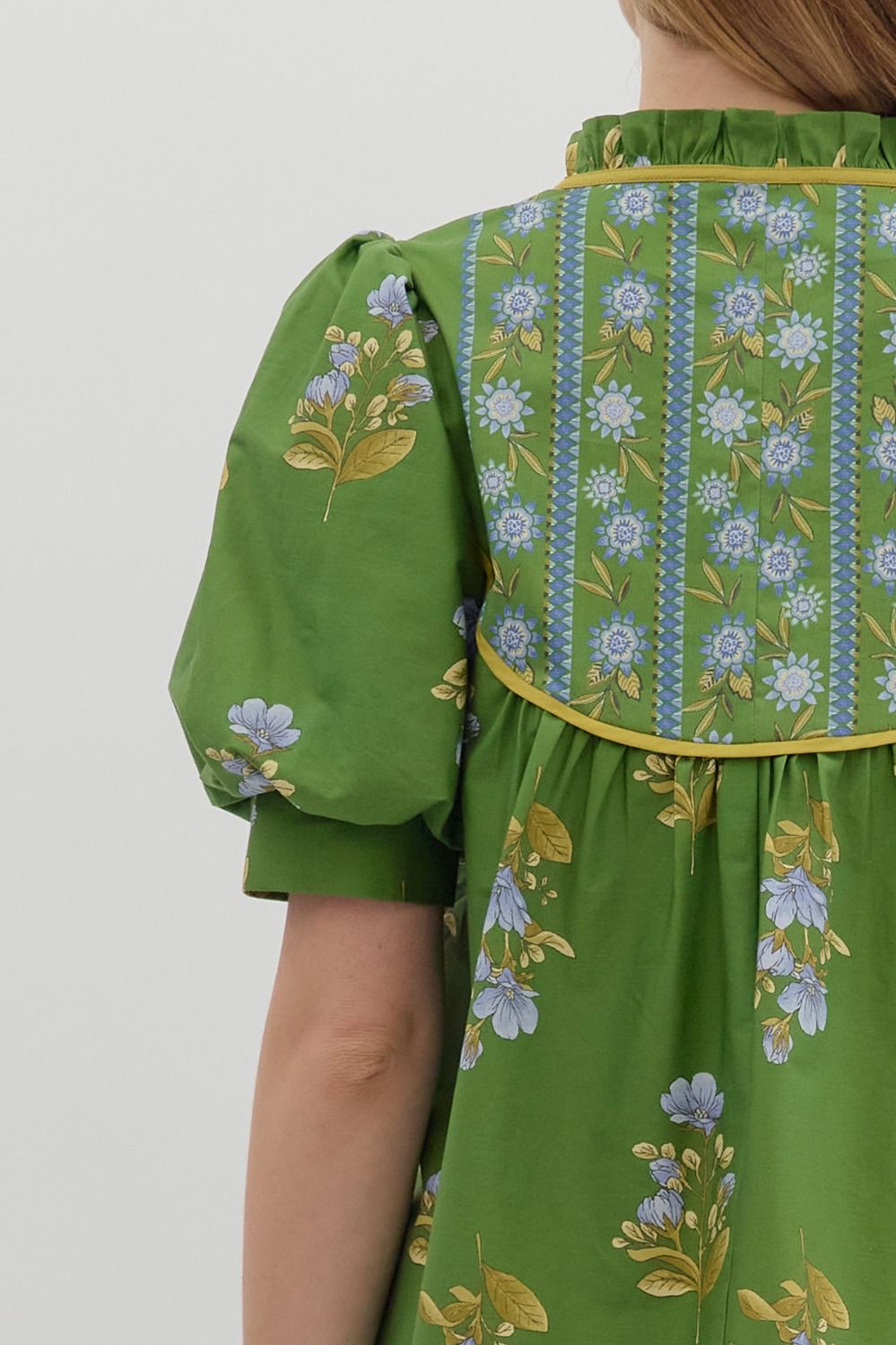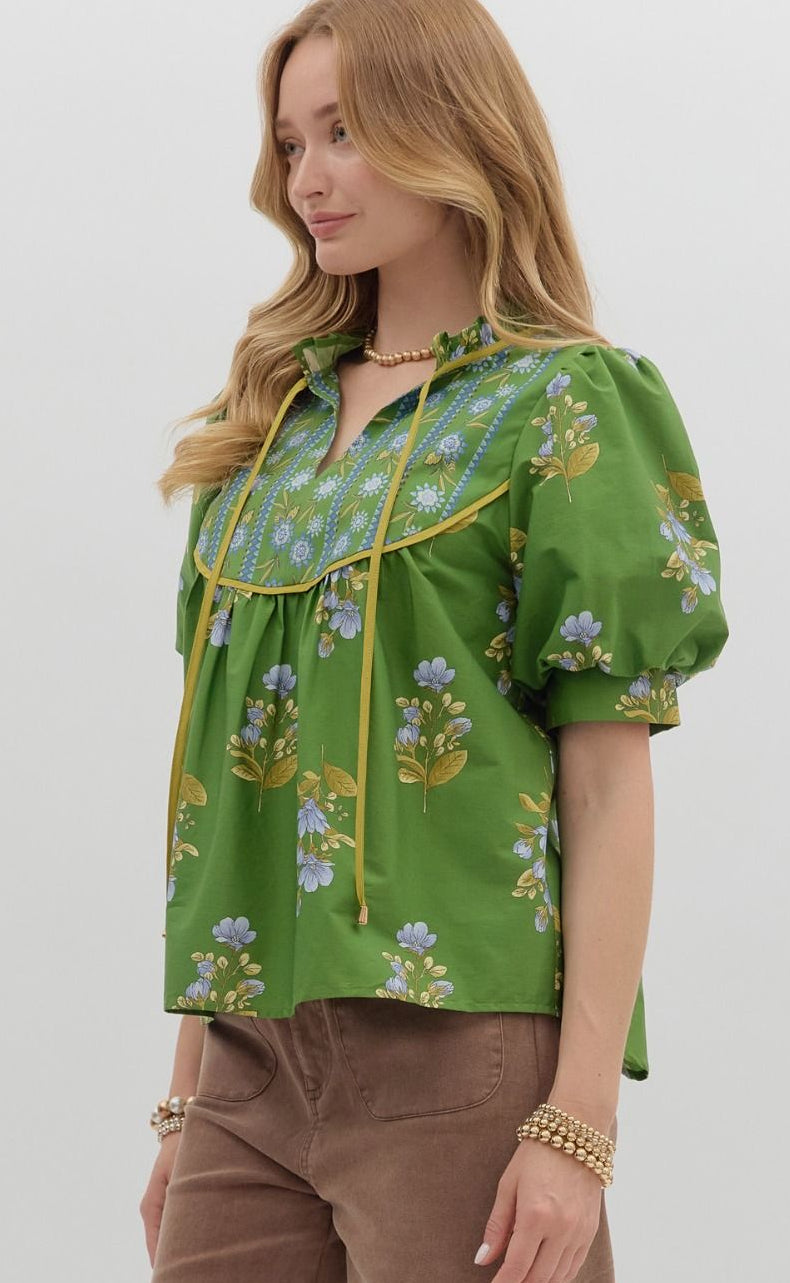 Floral print cuff band short bubble sleeve pullover top featuring contrasting print-accented yoke. Ruffle accented neck tie closure at front. Unlined. Woven. Non-sheer. Lightweight.