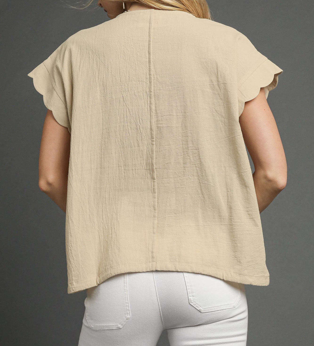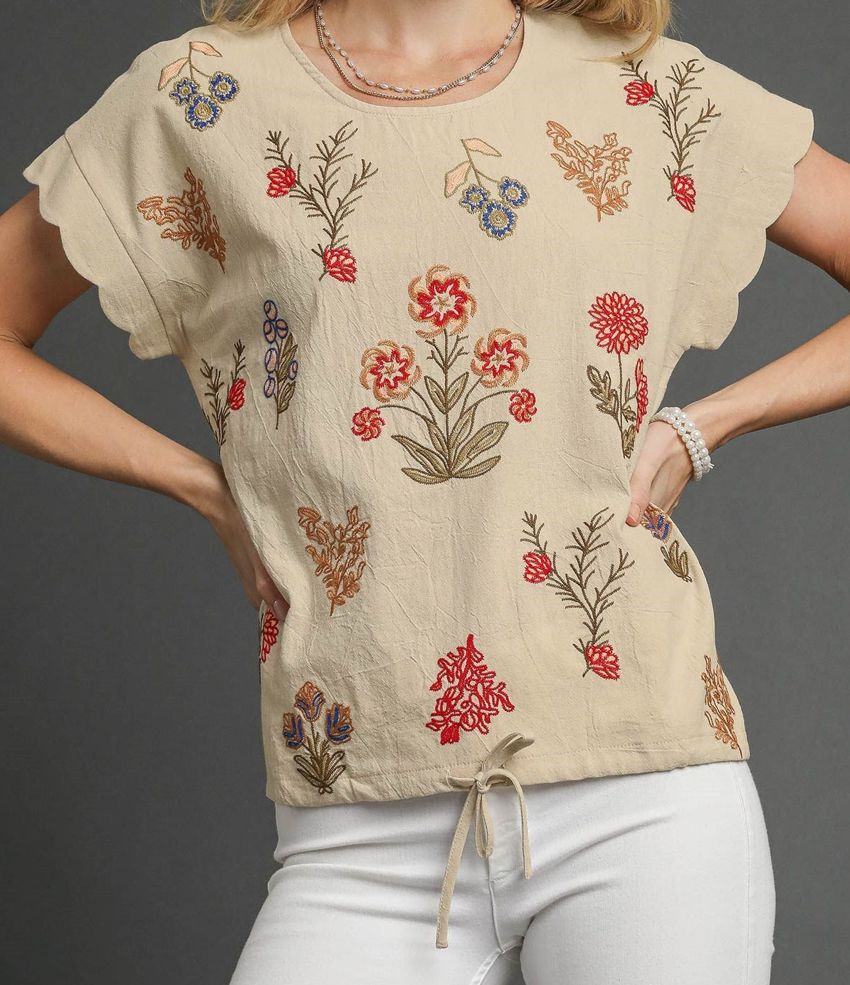 Embroidered Scallop Sleeve Top with Drawstring Hem
